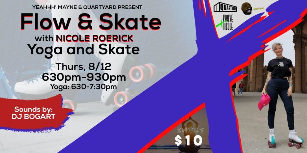 This is really an experience for us to come together and share space as a community. We will explore different ways to connect to our breath and allow this to set us up to skate the night away! All you need is an open mind and be willing to let your body flow and move. Yoga class will be from 630pm-730pm and skating will happen from 730pm-930pm, come for it all!