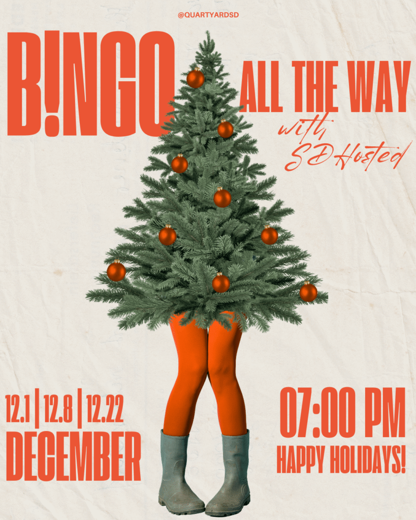 Introducing ‘B!NGO All The Way’☃️🔔 this December! On Friday December 1st, 8th, and 22nd, SD Hosted will be bringing a unique interactive holiday event to Quartyard🎄