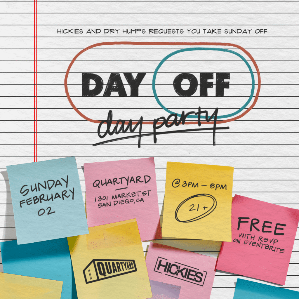 We're throwing a FREE day party with our friends over at Quartyard San Diego. Enjoy this Sunday with your friendly neighborhood Hickies & Dry Humps family.