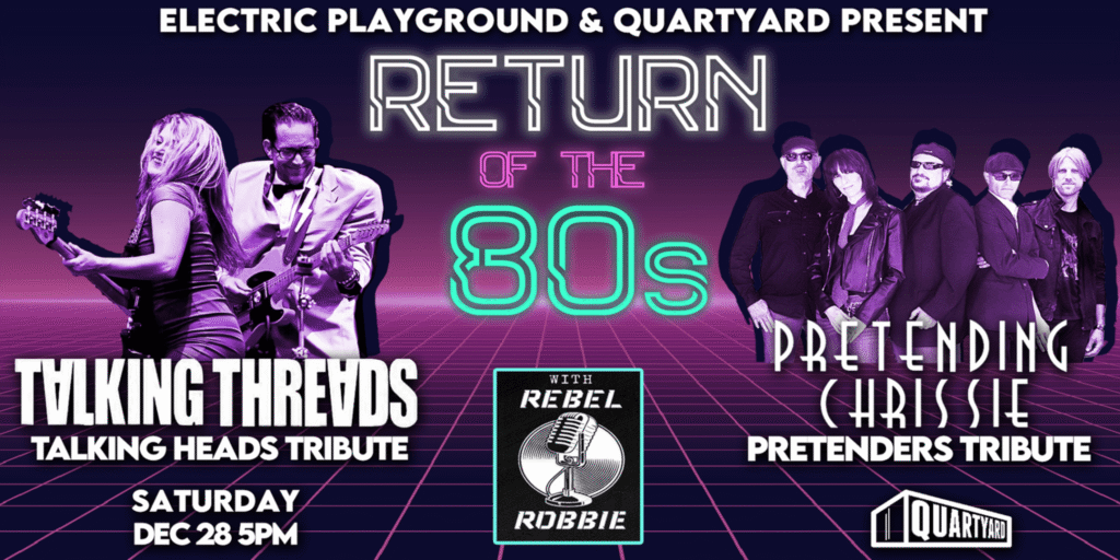 “Return of the 80’s” features 3 of the finest tribute bands in the country. Talking Threads (Talking Heads Tribute), Pretending Chrissie (Pretenders Tribute) and Rebel Robbie (80’s Tribute). Talking Threads will keep you dancing all night long. Blending theatricality, irony, comedy, creativity playing all The Talking Heads hits!! If you’ve never seen The Pretenders this is as close as it gets. Pretending Chrissie is the #1 Pretenders tribute band in the nation! Rebel Robbie has won the Orange County entertainer of the year with is 80’s tribute. This promises to be an evening you don’t want to miss!