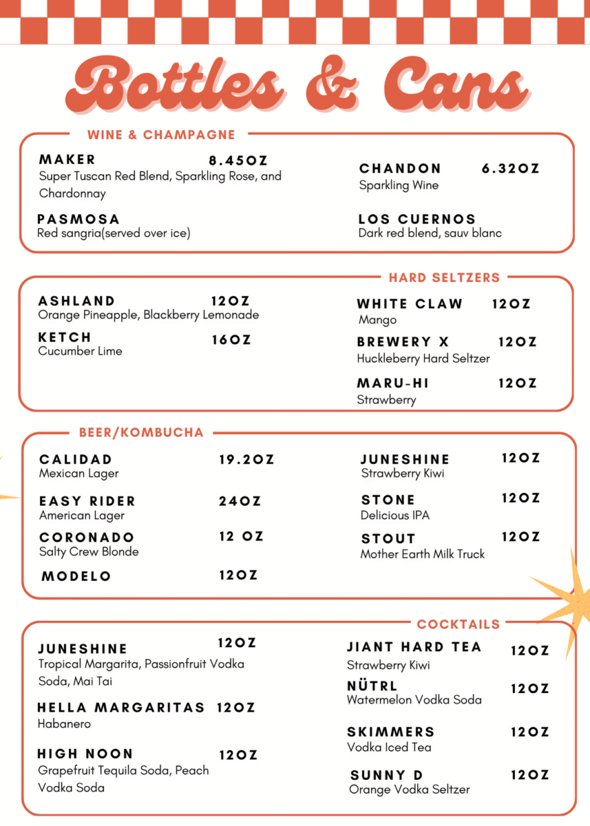 Sodas: Coke, Coke Zero, Sprite, Tonic, Club, Ginger Beer, Ginger Ale