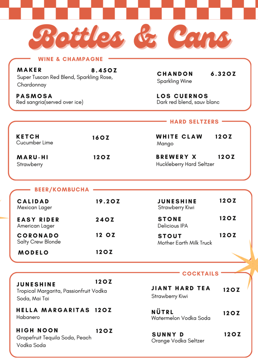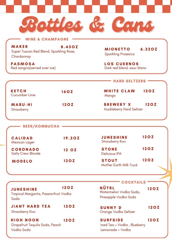 Sodas: Coke, Coke Zero, Sprite, Tonic, Club, Ginger Beer, Ginger Ale